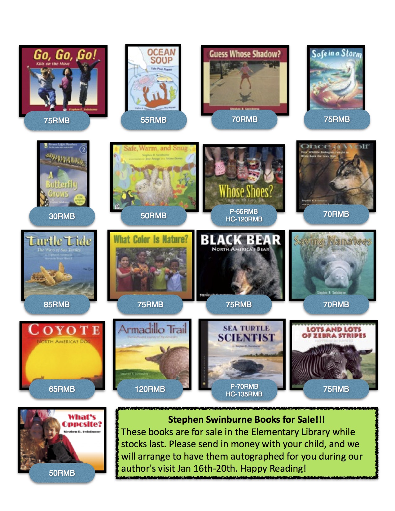 If your child likes books about animals, nature, non fiction, facts, then you are going to want to buy some of the books we have. There are over 500 books for sale. It sounds like a lot right? However, right now they are hidden in the Primary Library and we’ve already sold over 30! The hardback books in particular will sell very quickly, an autographed book always makes a wonderful gift, or personal keepsake.