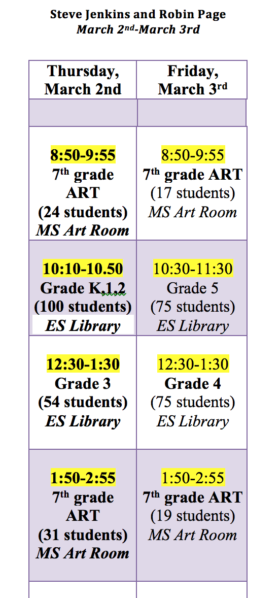 Below is the schedule for the authors visit; they are dividing their very short time with Middle School Art, so out time together will be intense and pack a punch. Until their visit, students are exploring all Steve and Robin have to offer as we read and discuss amazing books like Actual Size, Creature Features, Animals by the Numbers and the Caldecott Honor winner, What do you do with a Tail Like This?